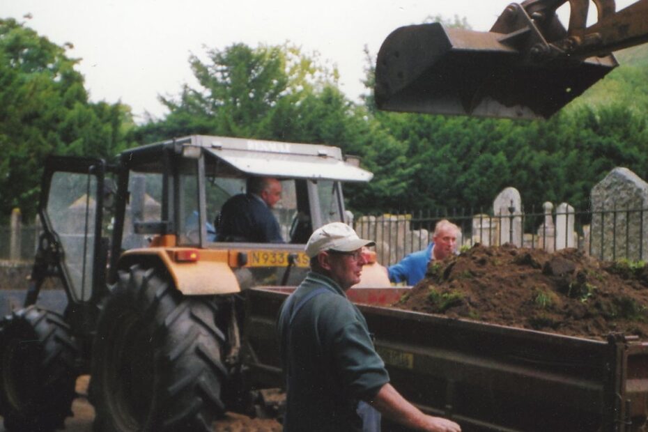 Taking banking away at Kilmorich Church Physical Description: Colour Photograph Subject: Kilmorich Church, Banking, Tractor, Trailer