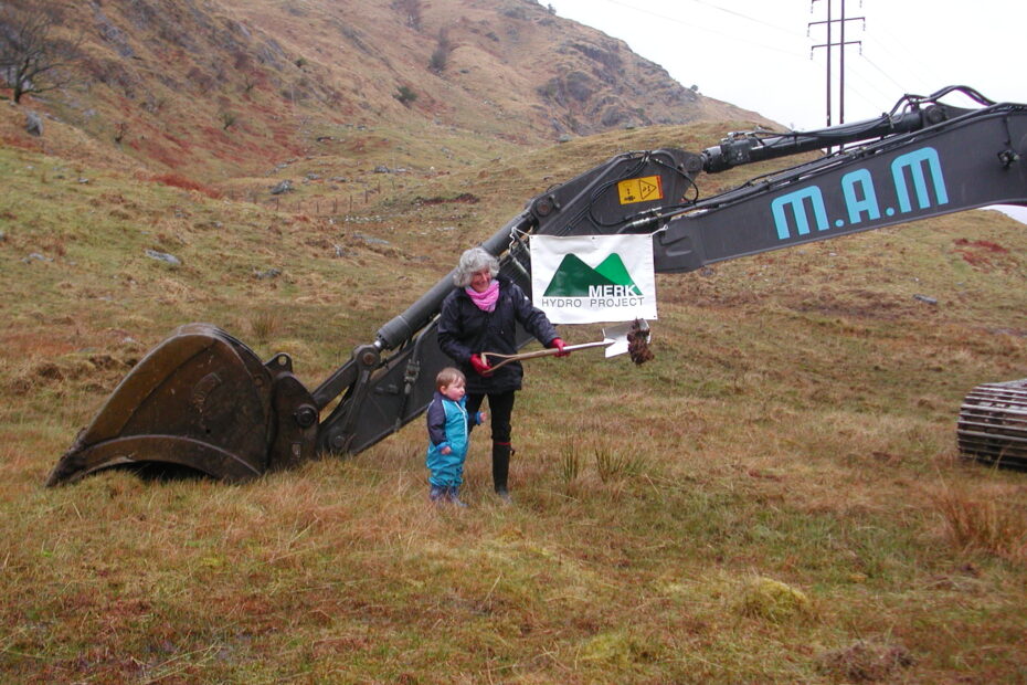 Merk Hydro Opening – Cutting The First Sod Physical Description: Colour Photograph Subject: Merk Hydro, First Sod, Digger, m.a.m.