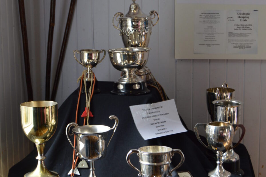 Shepherding Exhibition Physical Description: Colour Photograph Subject: shepherding exhibition, Village Hall, Sheepdog Trials, Cups