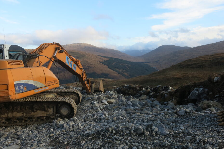 Merk Hydro Header Pond Construction Physical Description: Colour Photograph Subject: Merk Hydro, Header Pond, Construction, Glen Fyne, Digger, m.a.m.