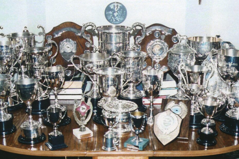Roddy MacDiarmid’s Trophy’s Physical Description: Colour Photograph Subject: Shepherd, Trophy’s, Sheepdog Trials