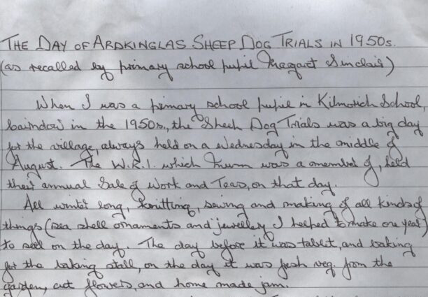 Memories of Ardkinglas Sheepdog Trial 1950s Hand written document describing sheep dog trials by Margaret Campbell (Sinclair) (1950)