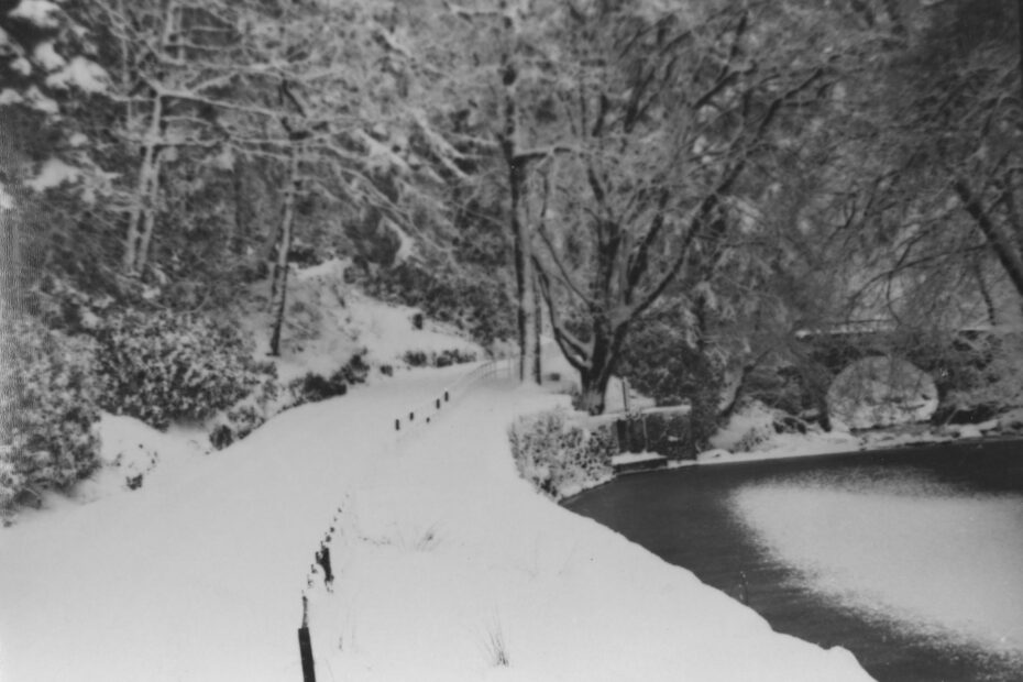 East Lodge Drive Ardkinglas Physical Description: Black And White Photograph Subject: Ardkinglas House, East lodge drive, Winter scene, Dam