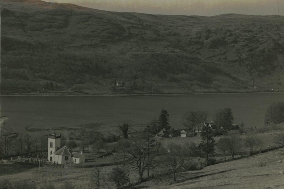 Kilmorich Church Physical Description: Black And White Photograph Subject: Kilmorich Church, New Graveyard, Cairndow Hotel, Post Office