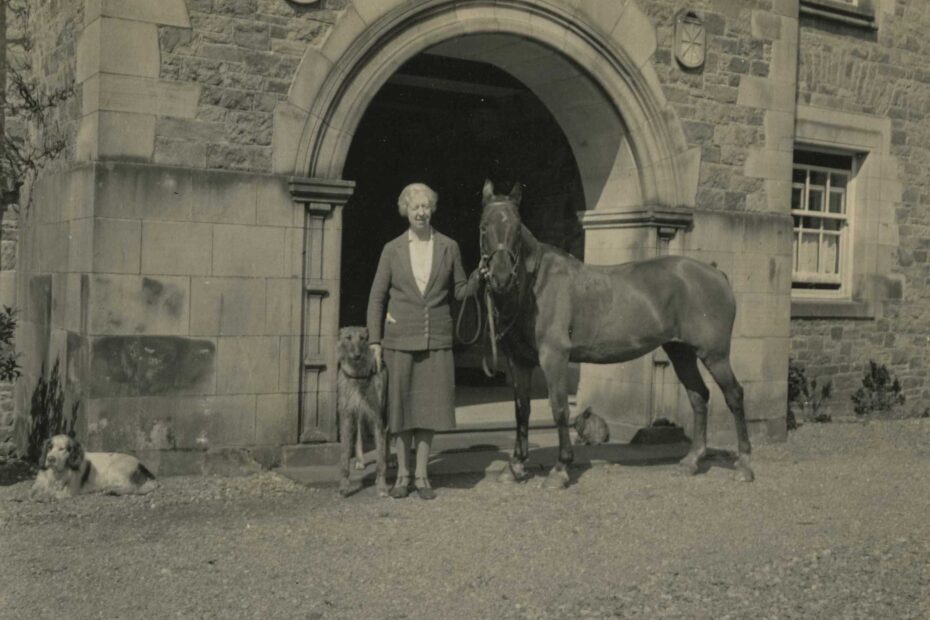 Daisy Powell-Jones Physical Description: Black And White Photograph Subject: Ardkinglas House, Horse, Dog, Deerhound