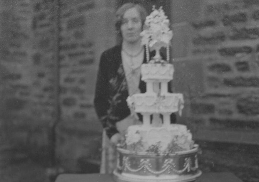 Nicolas Rennie Physical Description: Black And White Photograph Subject: wedding, Wedding Cake Notes: Ella McIntosh’s Wedding cake with Nicholas behind.