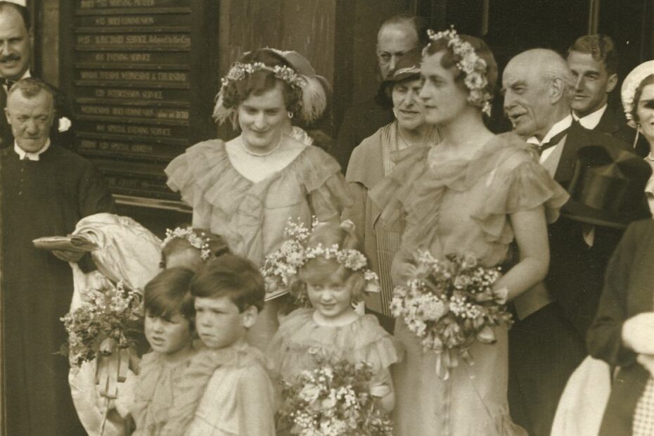 Colin Montgomery & Amelia Lang’s Wedding Physical Description: Black And White Photograph Subject: wedding Notes: The Bridesmaid’s dresses were pale blue, flowers were pink carnations.